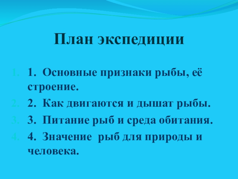 План экспедиции1. Основные признаки рыбы, её  строение.2. Как двигаются и дышат рыбы.3. Питание рыб и среда