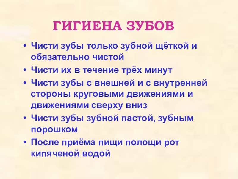 ГИГИЕНА ЗУБОВЧисти зубы только зубной щёткой и обязательно чистойЧисти их в течение трёх минутЧисти зубы с внешней