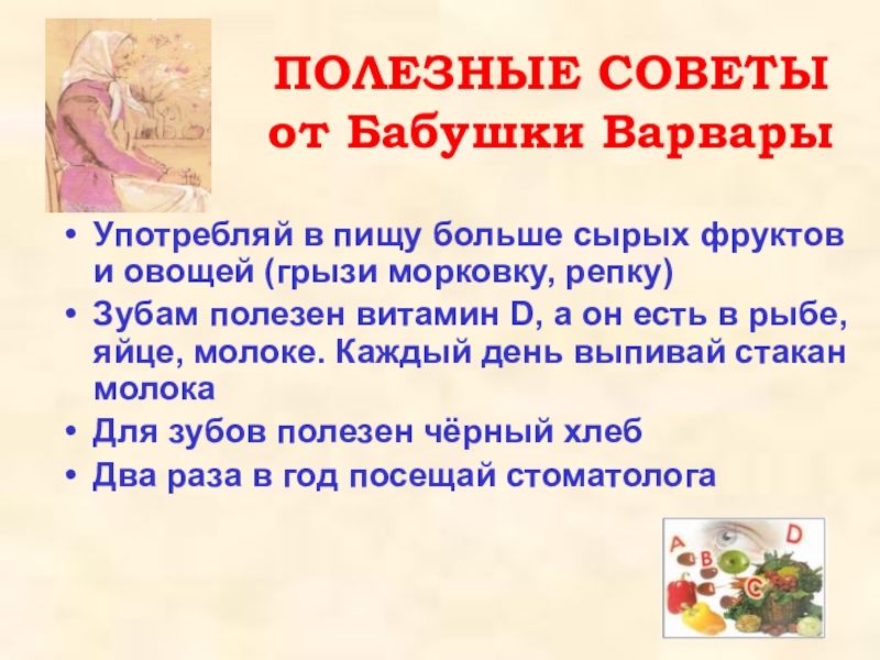 ПОЛЕЗНЫЕ СОВЕТЫ  от Бабушки ВарварыУпотребляй в пищу больше сырых фруктов и овощей (грызи морковку, репку)Зубам полезен