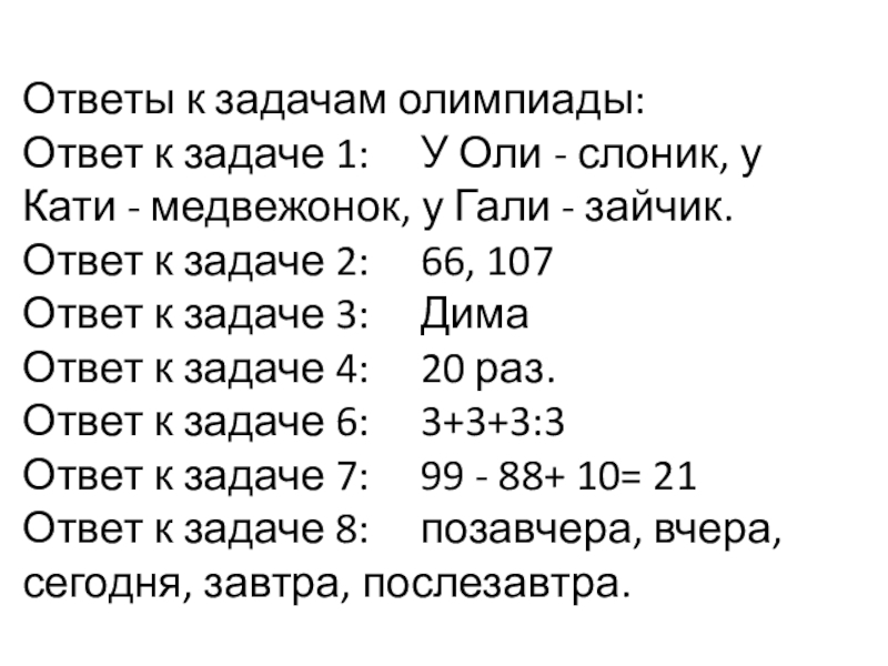 играли с медвежонком, зайчиком и слоником. Известно, что Катя не прятала зайчика, а Оля не прятала ни зайчика, ни медвежонка. У кого какая игрушка?