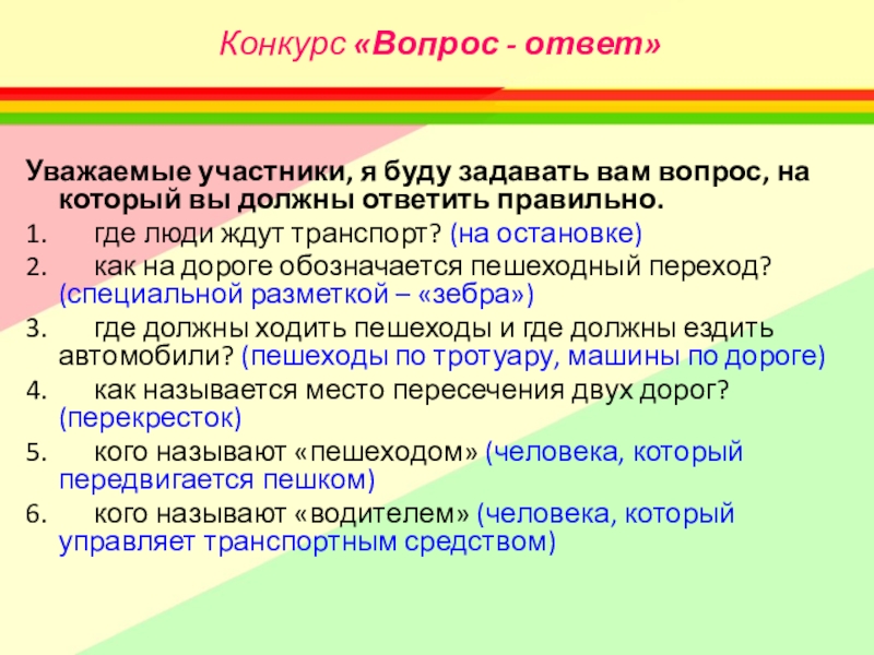 2. «Вопрос - ответ» - ответы участников на вопросы по правилам дорожного движения - по 7 вопросов – за каждый правильный ответ 1 балл