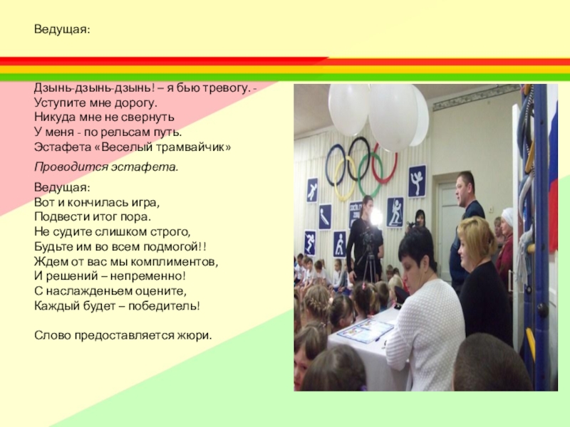 6. Эстафета «Веселый трамвайчик» - Дети делятся на две команды. Водитель - капитан трамвая держит в руках обруч. Команда – пассажиры, они занимают свои места на остановке друг за другом. Каждый трамвай может перевезти только одного пассажира, который занимает свое место в обруче. Конечная остановка на противоположной стороне зала. – Кто быстрее завершит эстафету, тот и победил.–максимально 2 балл.