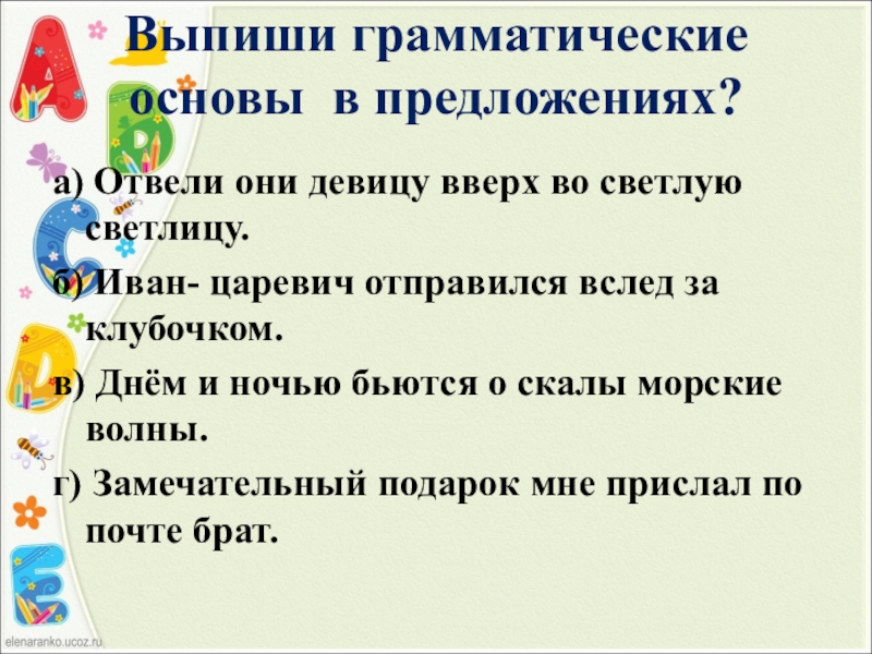 Слайд 15Выпиши грамматические основы в предложениях?