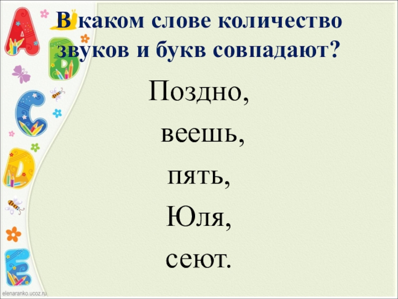 Слайд 11В каком слове количество звуков и букв совпадают?