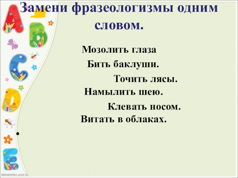 Слайд 7Замени фразеологизмы одним словом.