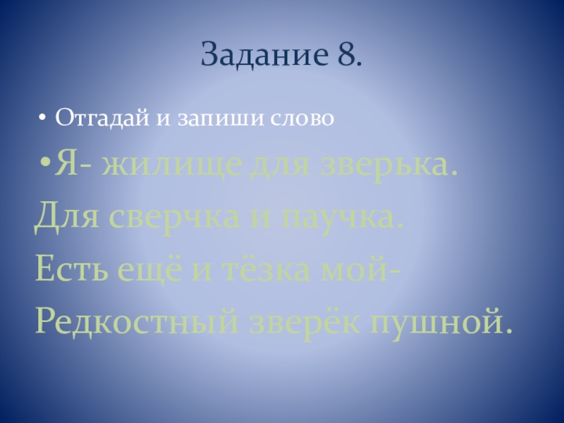 Задание 8.Отгадай и запиши словоЯ- жилище для зверька.Для сверчка и паучка.Есть ещё и тёзка мой-Редкостный зверёк пушной.