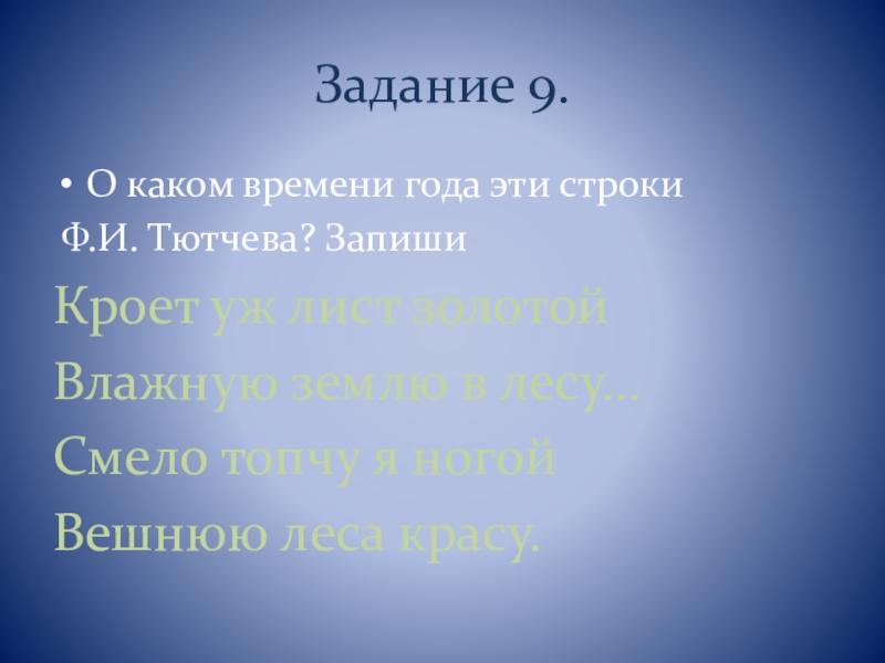 Задание 9.О каком времени года эти строки Ф.И. Тютчева? ЗапишиКроет уж лист золотойВлажную землю в лесу…Смело топчу