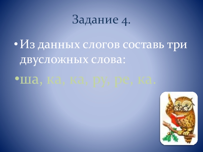 Задание 4.Из данных слогов составь три двусложных слова: ша, ка, ка, ру, ре, ка.