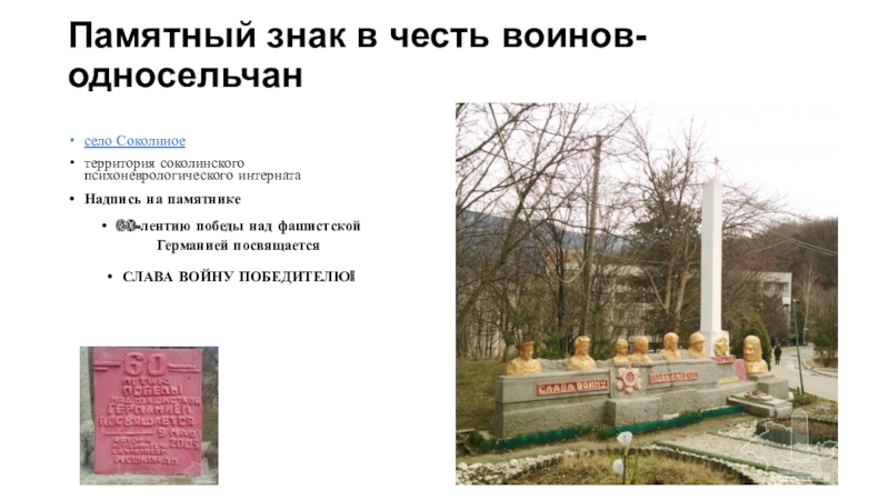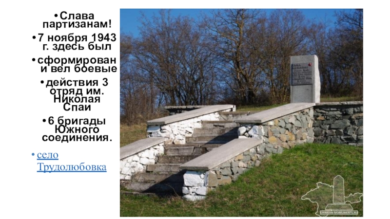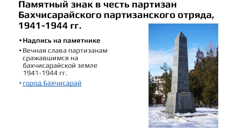 Слайд 27Памятный знак в честь партизан Бахчисарайского партизанского отряда, 1941-1944 гг.