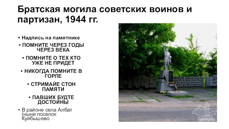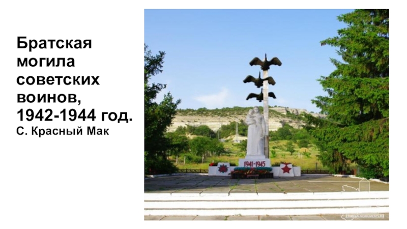 Слайд 15Братская могила советских воинов, 1942-1944 год.