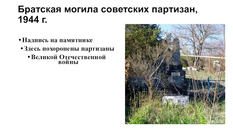 Слайд 13Братская могила советских воинов и партизан, 1944 гг.