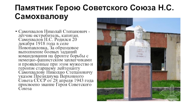 Слайд 25Памятник Герою Советского Союза Н.С. Самохвалову