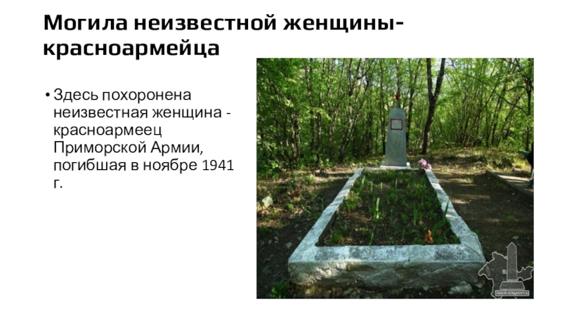 Здесь похоронена неизвестная женщина - красноармеец Приморской Армии, погибшая