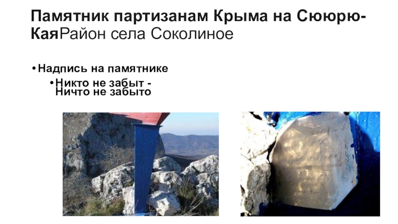 Слайд 28Памятник партизанам Крыма на Сююрю-КаяРайон села Соколиное