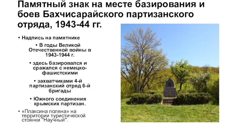 Слайд 29Памятный знак на месте базирования и боев Бахчисарайского партизанского отряда, 1943-44