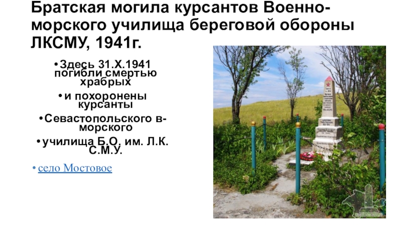Слайд 16Братская могила курсантов Военно-морского училища береговой обороны ЛКСМУ, 1941г.