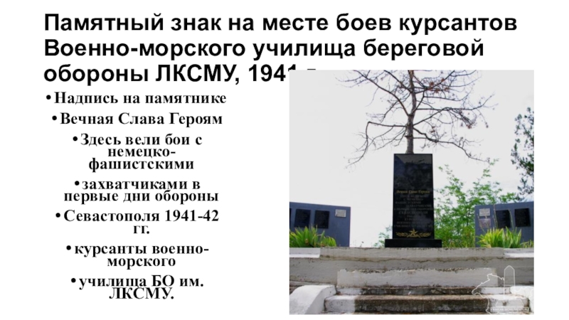 Слайд 17Памятный знак на месте боев курсантов Военно-морского училища береговой обороны ЛКСМУ,