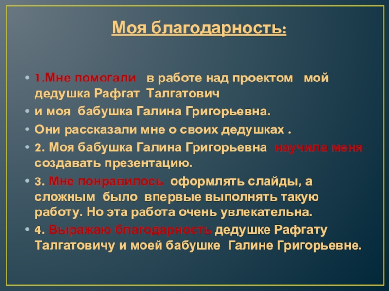 4. Выражаю благодарность дедушке Рафгату Талгатовичу и моей бабушке Галине Григорьевне.