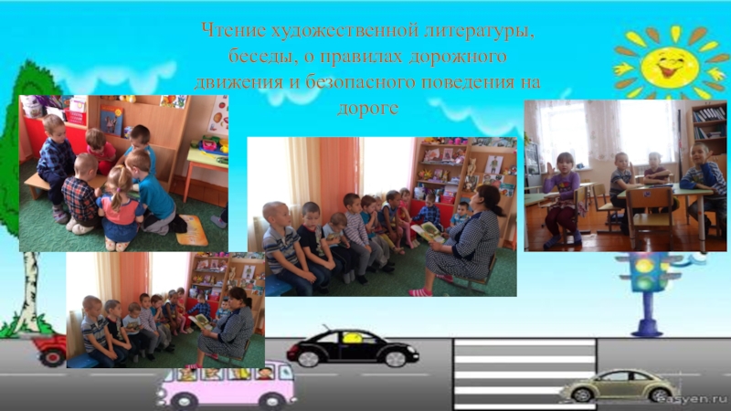 Слайд 4Чтение художественной литературы, беседы, о правилах дорожного движения и безопасного поведения