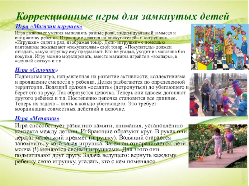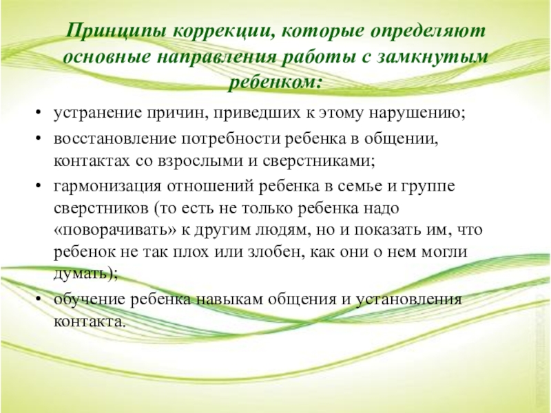 Слайд 10Принципы коррекции, которые определяют основные направления работы с замкнутым ребенком:
