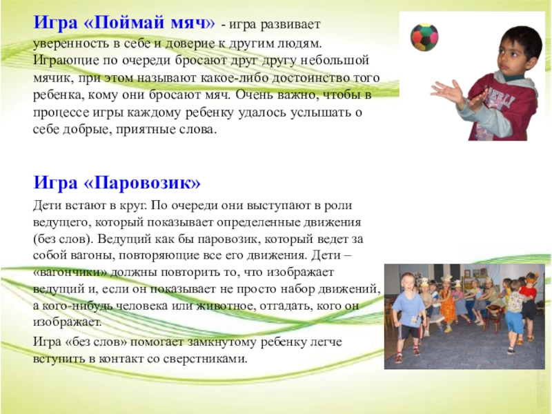 Слайд 18Игра «Поймай мяч» - игра развивает уверенность в себе и доверие