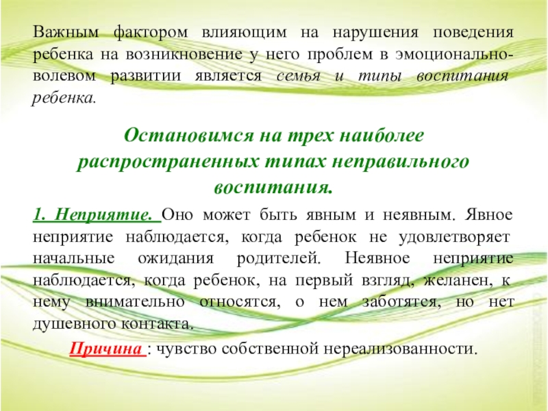 1. Неприятие. Оно может быть явным и неявным. Явное неприятие наблюдается, когда ребенок не удовлетворяет начальные ожидания родителей. Неявное неприятие наблюдается, когда ребенок, на первый взгляд, желанен, к нему внимательно относятся, о нем заботятся, но нет душевного контакта.