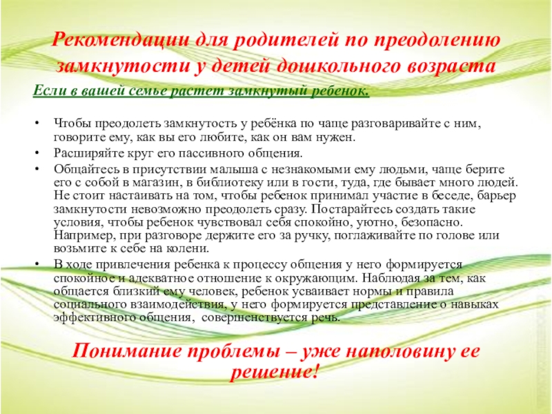 Слайд 23Рекомендации для родителей по преодолению замкнутости у детей дошкольного возраста