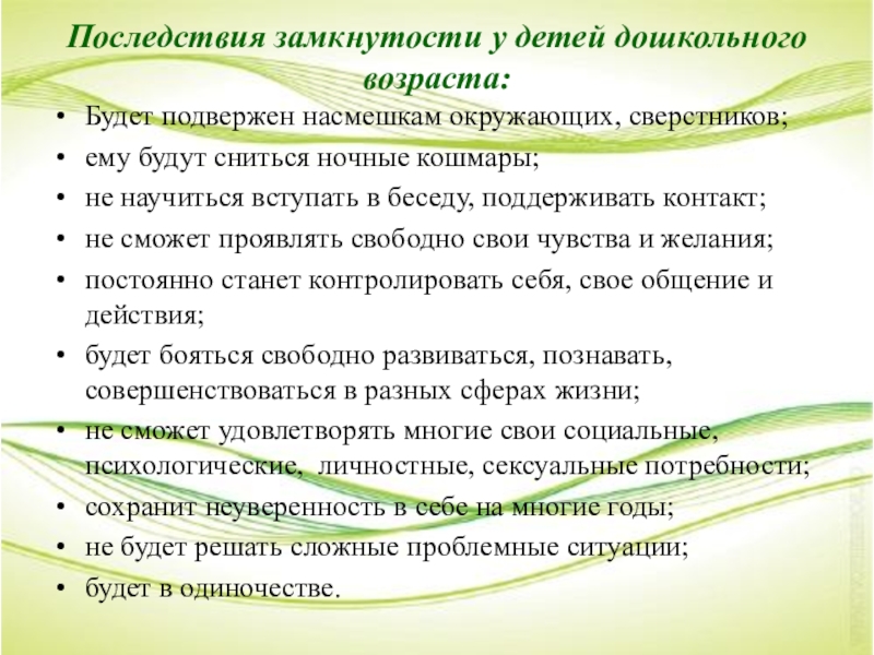 Слайд 9Последствия замкнутости у детей дошкольного возраста: