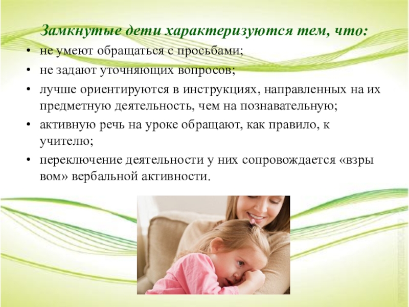 Слайд 12Замкнутые дети характеризуются тем, что: