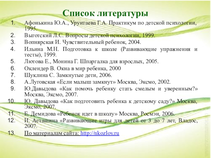 Ю.Давыдова «Как помочь ребенку стать смелым и уверенным?» Москва, Эксмо, 2007.