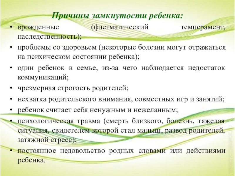 Основные факторы, влияющие на поведение ребенка, характеризующееся как замкнутое: