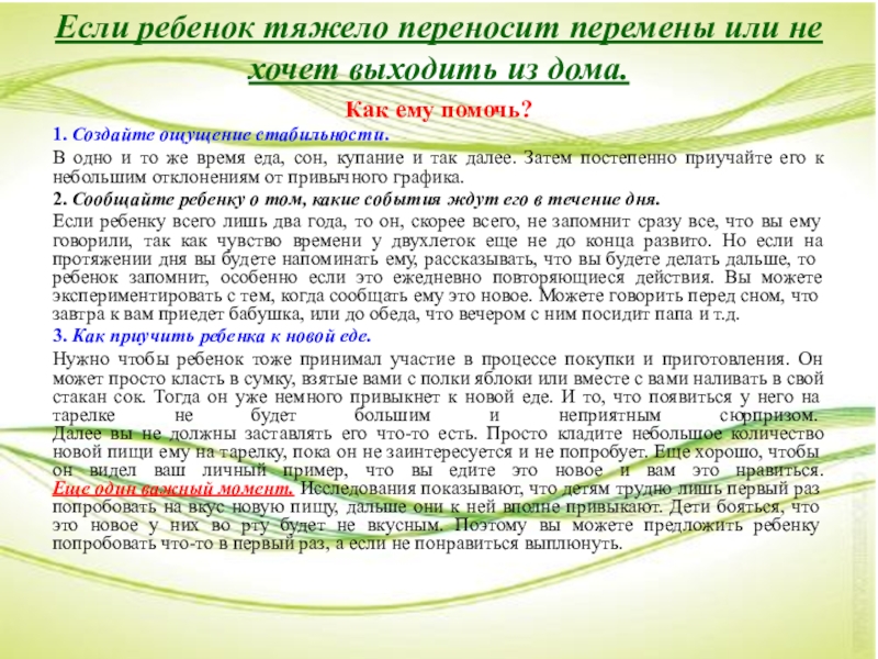 Слайд 25Если ребенок тяжело переносит перемены или не хочет выходить из дома.