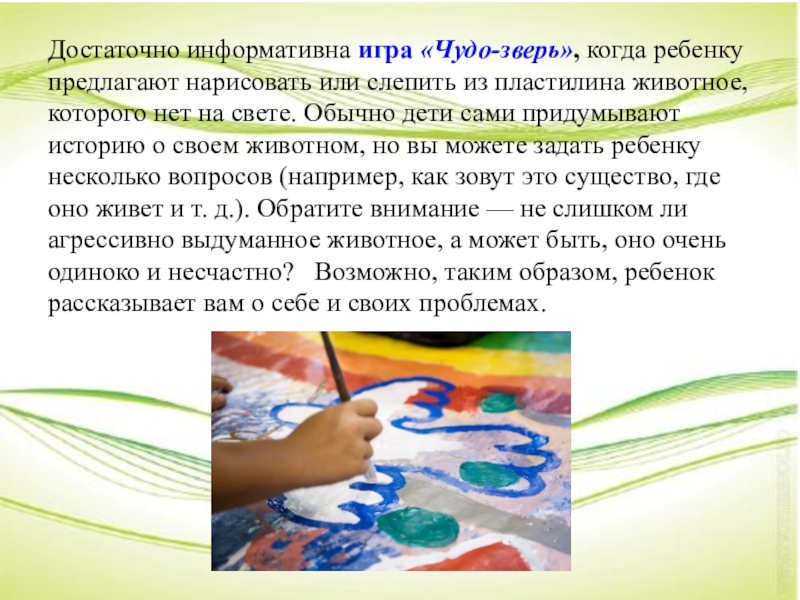 Слайд 24Достаточно информативна игра «Чудо-зверь», когда ребенку предлагают нарисовать или слепить из пластилина