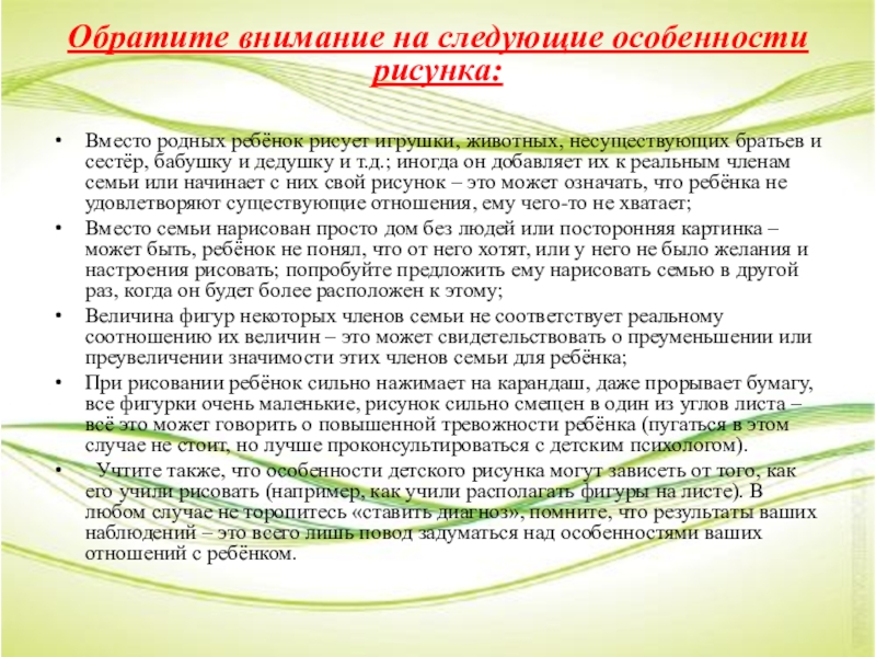 Учтите также, что особенности детского рисунка могут зависеть от того, как его учили рисовать (например, как учили располагать фигуры на листе). В любом случае не торопитесь «ставить диагноз», помните, что результаты ваших наблюдений – это всего лишь повод задуматься над особенностями ваших отношений с ребёнком.