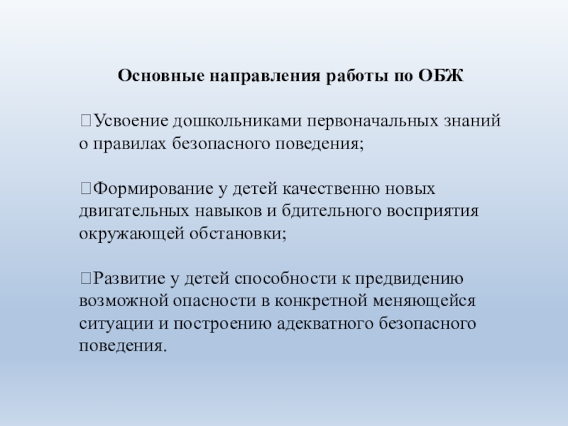 Основные направления работы по ОБЖУсвоение дошкольниками первоначальных знаний о правилах безопасного поведения;Формирование у детей качественно новых двигательных
