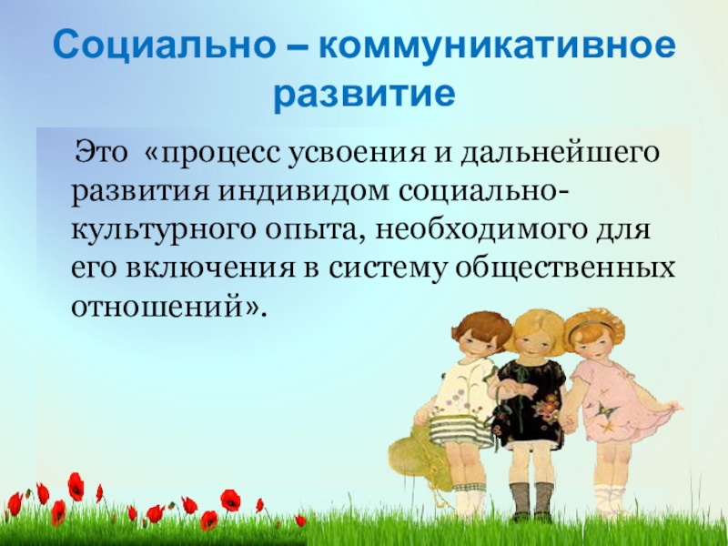 Социально – коммуникативное развитие Это «процесс усвоения и дальнейшего развития индивидом социально-культурного опыта, необходимого для его включения в систему общественных отношений».