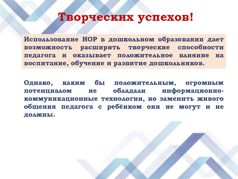 Однако, каким бы положительным, огромным потенциалом не обладали информационно-коммуникационные технологии, но заменить живого общения педагога с ребёнком они не могут и не должны.