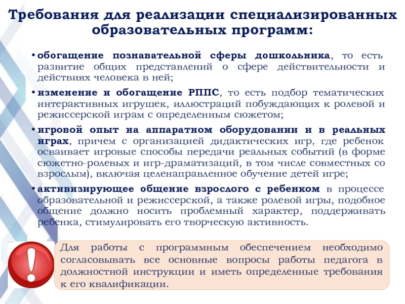 Для работы с программным обеспечением необходимо согласовывать все основные вопросы работы педагога в должностной инструкции и иметь определенные требования к его квалификации.