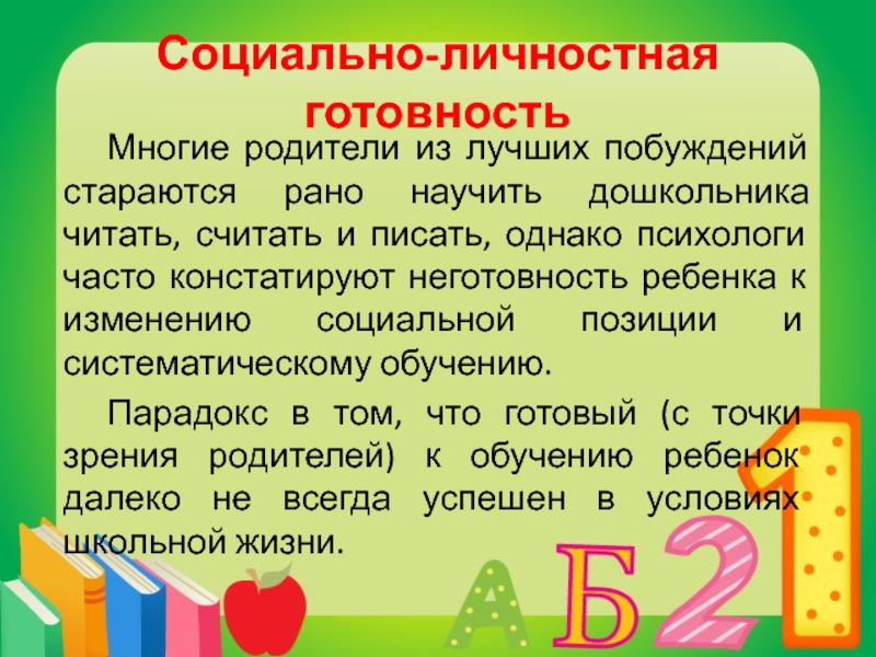 считать и писать, однако психологи часто констатируют неготовность ребенка к изменению социальной позиции и систематическому обучению.