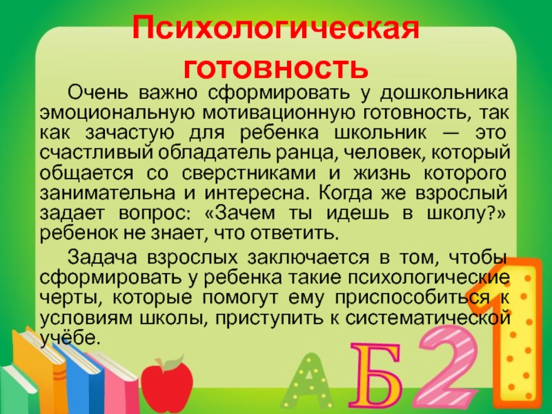 Задача взрослых заключается в том, чтобы сформировать у ребенка такие психологические черты, которые помогут ему приспособиться к условиям школы, приступить к систематической учёбе.