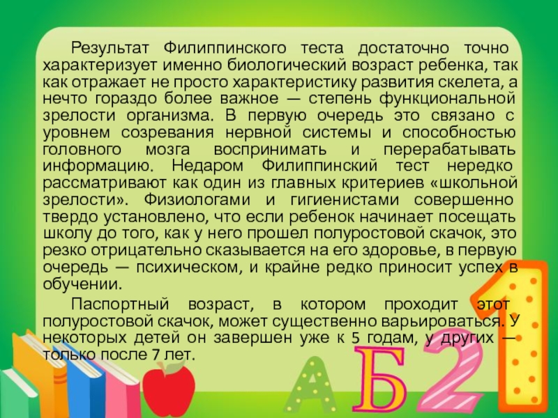 Слайд 5 Результат Филиппинского теста достаточно точно характеризует именно биологический возраст ребенка, так