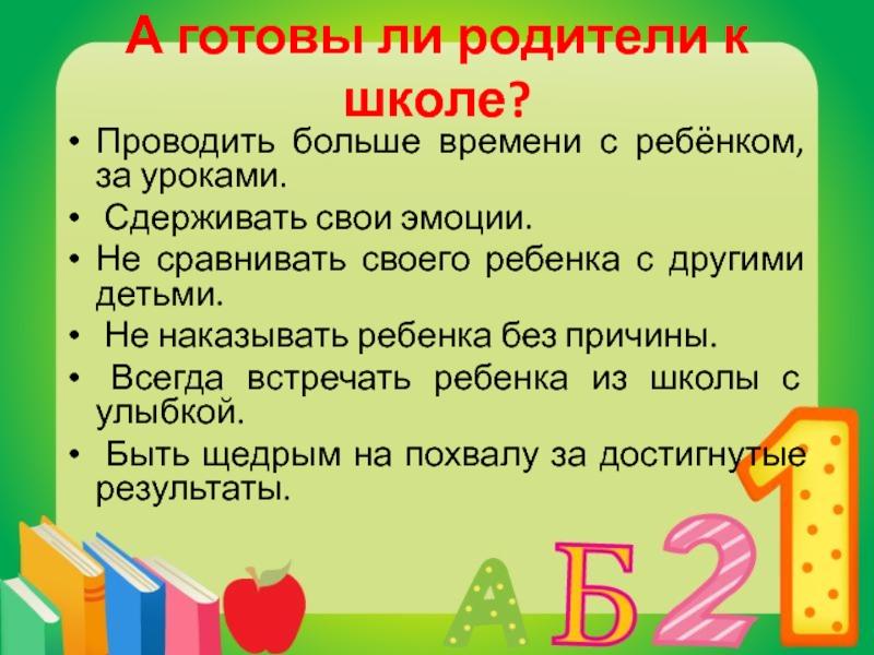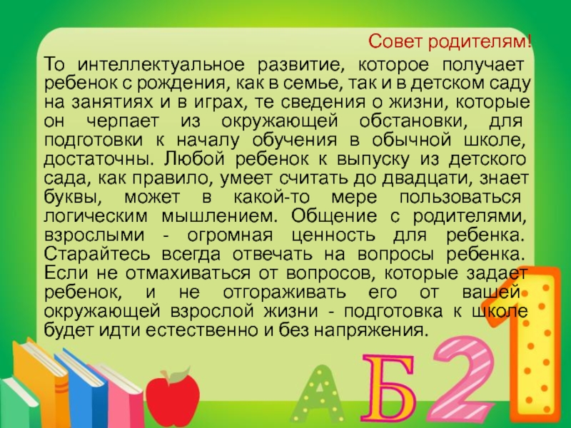 семье, так и в детском саду на занятиях и в играх, те сведения о жизни, которые он черпает из окружающей обстановки, для подготовки к началу обучения в обычной школе, достаточны. Любой ребенок к выпуску из детского сада, как правило, умеет считать до двадцати, знает буквы, может в какой-то мере пользоваться логическим мышлением. Общение с родителями, взрослыми - огромная ценность для ребенка. Старайтесь всегда отвечать на вопросы ребенка. Если не отмахиваться от вопросов, которые задает ребенок, и не отгораживать его от вашей окружающей взрослой жизни - подготовка к школе будет идти естественно и без напряжения.