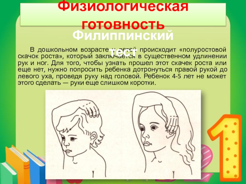 как отражает не просто характеристику развития скелета, а нечто гораздо более важное — степень функциональной зрелости организма. В первую очередь это связано с уровнем созревания нервной системы и способностью головного мозга воспринимать и перерабатывать информацию. Недаром Филиппинский тест нередко рассматривают как один из главных критериев «школьной зрелости». Физиологами и гигиенистами совершенно твердо установлено, что если ребенок начинает посещать школу до того, как у него прошел полуростовой скачок, это резко отрицательно сказывается на его здоровье, в первую очередь — психическом, и крайне редко приносит успех в обучении.