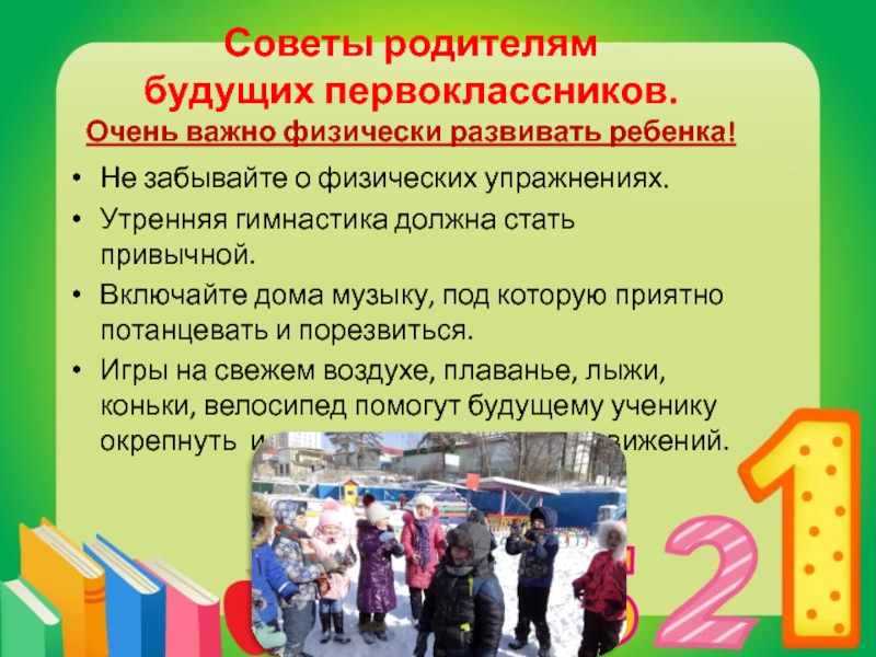 Игры на свежем воздухе, плаванье, лыжи, коньки, велосипед помогут будущему ученику окрепнуть и укрепить координацию движений.