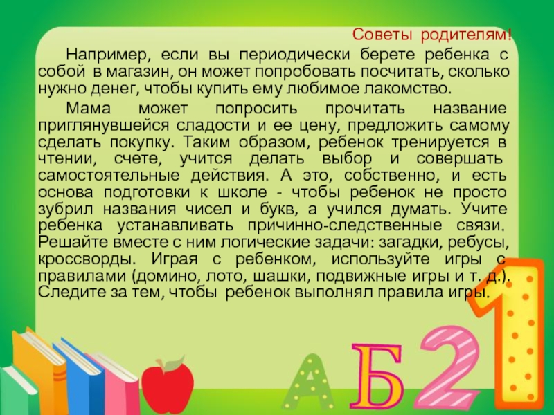 Мама может попросить прочитать название приглянувшейся сладости и ее цену, предложить самому сделать покупку. Таким образом, ребенок тренируется в чтении, счете, учится делать выбор и совершать самостоятельные действия. А это, собственно, и есть основа подготовки к школе - чтобы ребенок не просто зубрил названия чисел и букв, а учился думать. Учите ребенка устанавливать причинно-следственные связи. Решайте вместе с ним логические задачи: загадки, ребусы, кроссворды. Играя с ребенком, используйте игры с правилами (домино, лото, шашки, подвижные игры и т. д.). Следите за тем, чтобы ребенок выполнял правила игры.