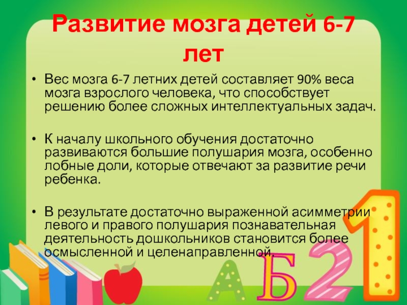 К началу школьного обучения достаточно развиваются большие полушария мозга, особенно лобные доли, которые отвечают за развитие речи ребенка.