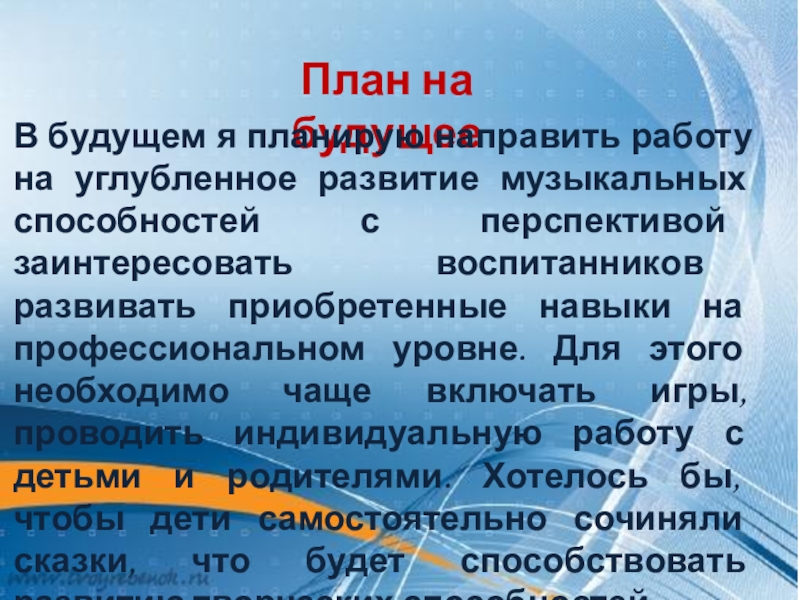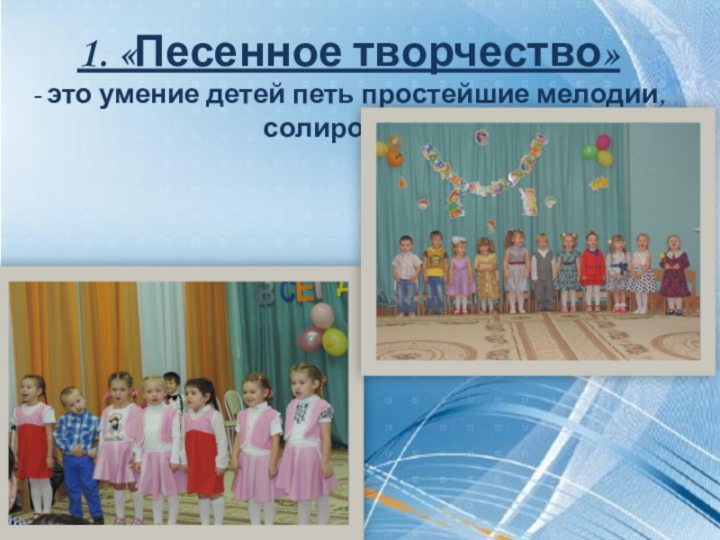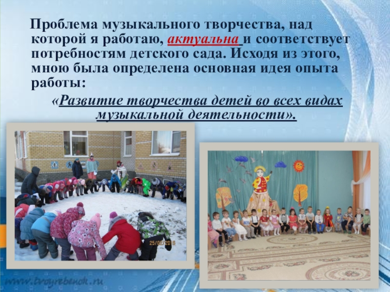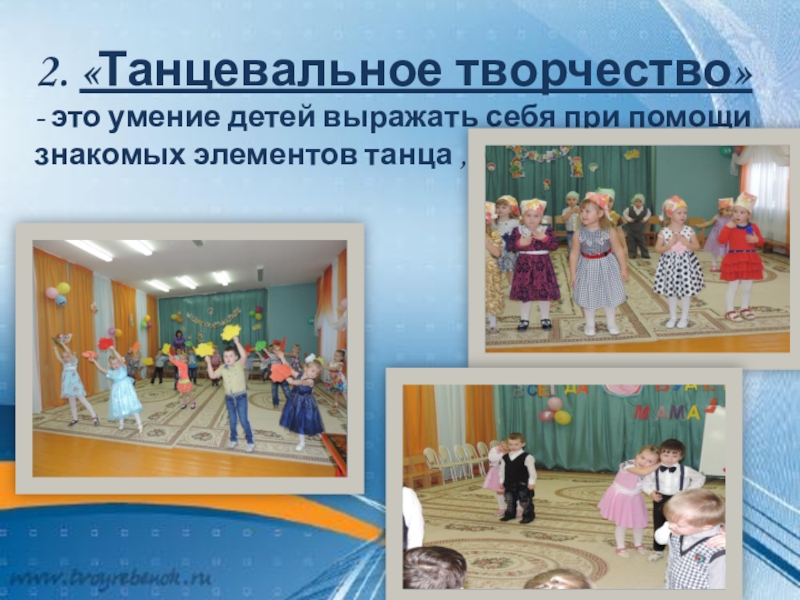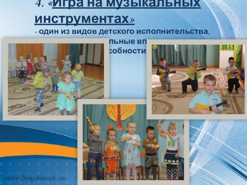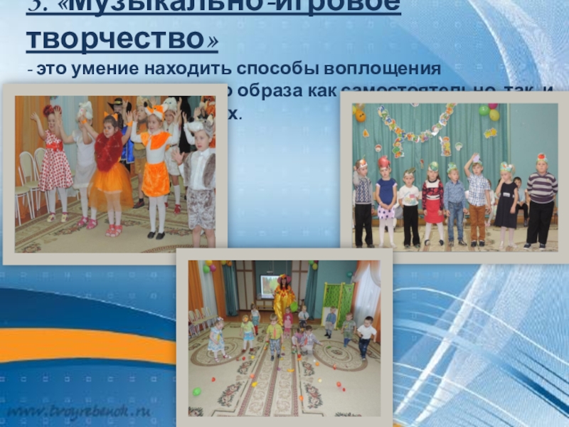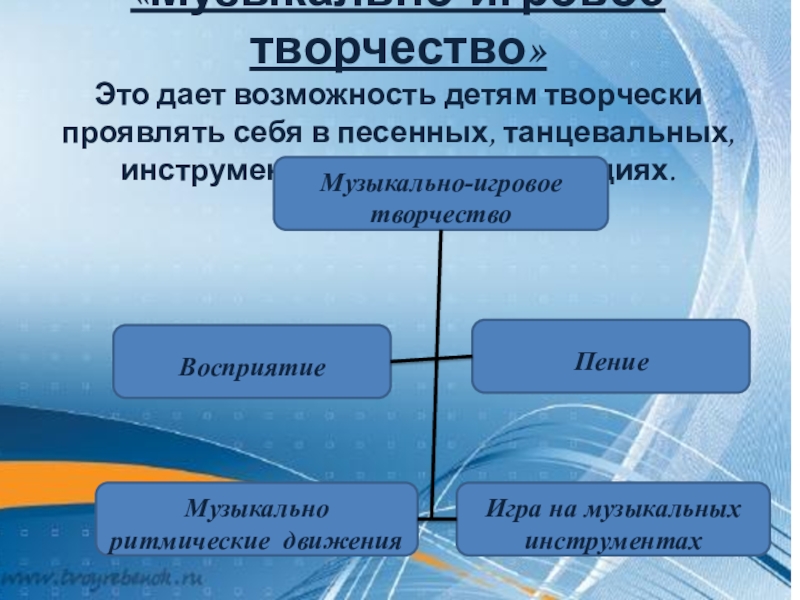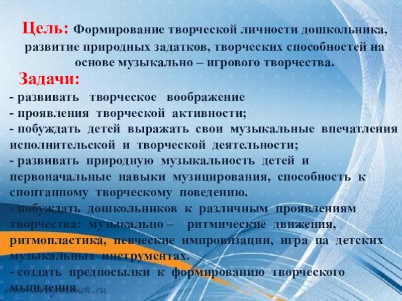 - побуждать дошкольников к различным проявлениям творчества: музыкально – ритмические движения, ритмопластика, певческие импровизации, игра на детских музыкальных инструментах.