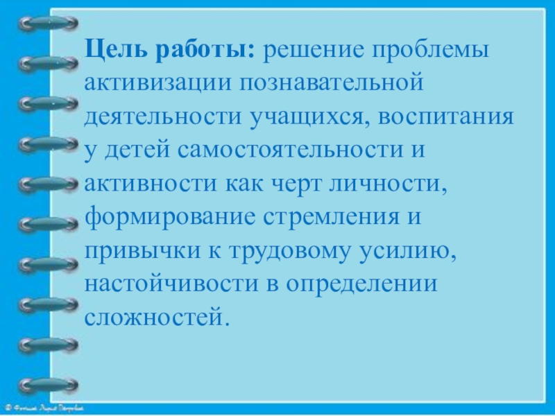 Слайд 7Цель работы: решение проблемы активизации познавательной деятельности учащихся, воспитания у детей