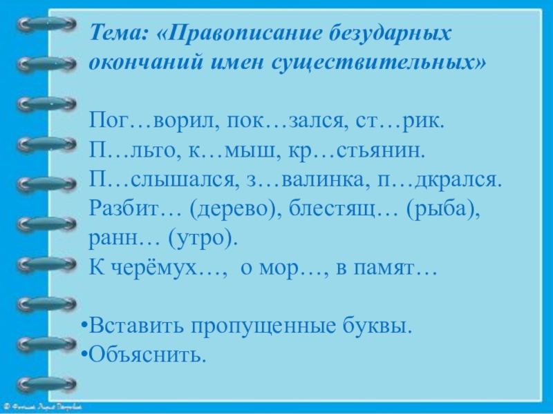 Слайд 15Тема: «Правописание безударных окончаний имен существительных»
