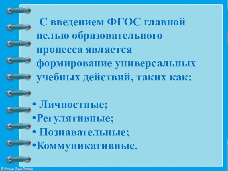 Слайд 2 С введением ФГОС главной целью образовательного процесса является формирование универсальных